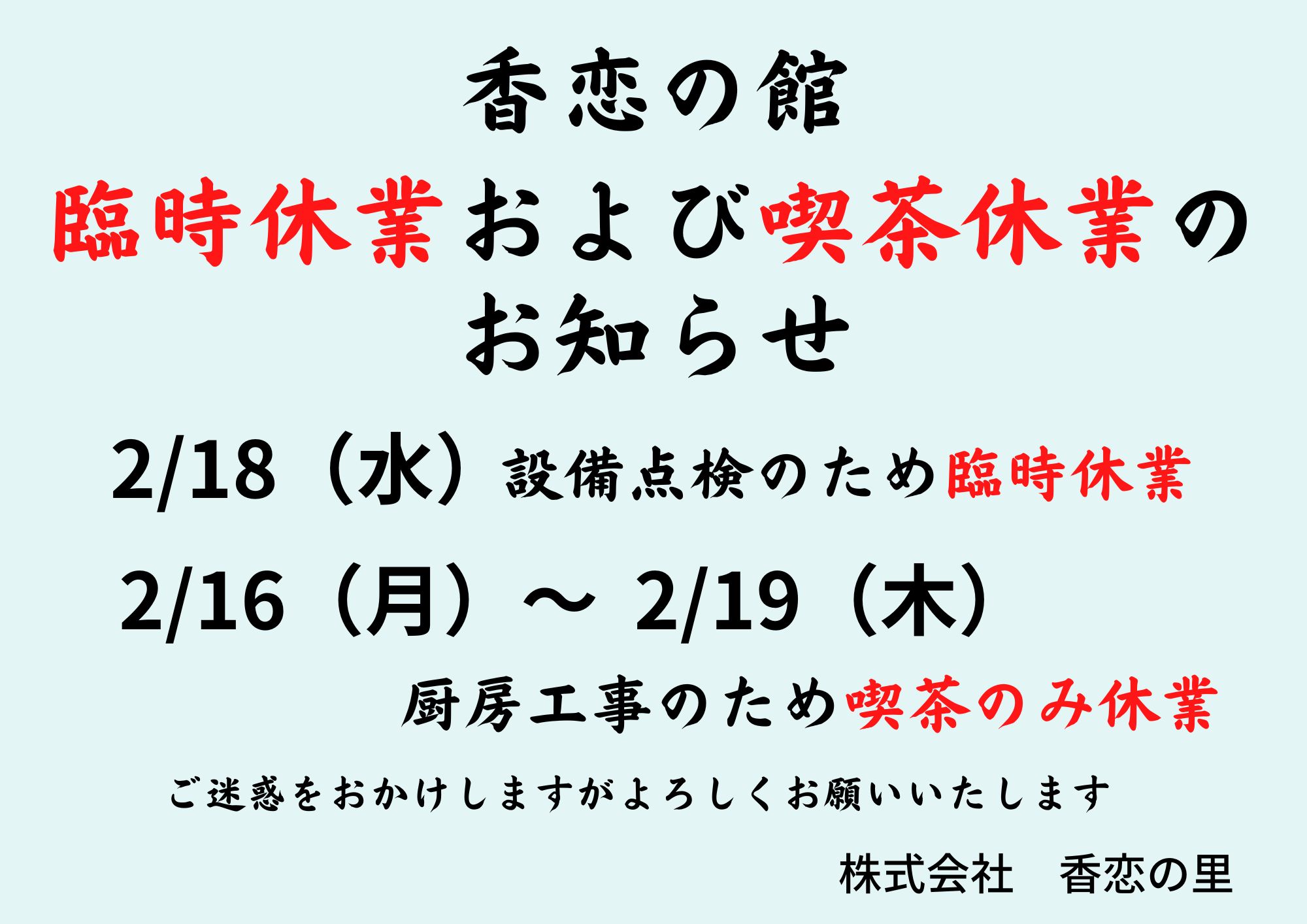2月18日㈬は設備点検のため臨時休業とさせていただきます。